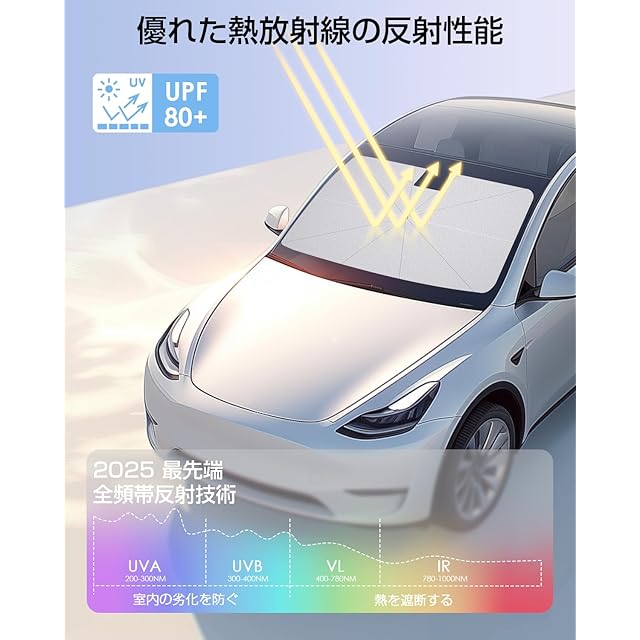 【最新の4層構造で全天候型保護】専用の日除けは、特殊断熱素材、アルミ遮光シート、高品質不織布を採用した4層構造で、紫外線を98%カット。強烈な日差しを反射し、車内を涼しく快適に保ちます。炎天下の駐車でも愛車を守り、旅行や車中泊でも冷却を待たずに快適に出発できます。エアコン使用を減らすことで、省エネ効果も期待できるオーナー必携のアイテムです。