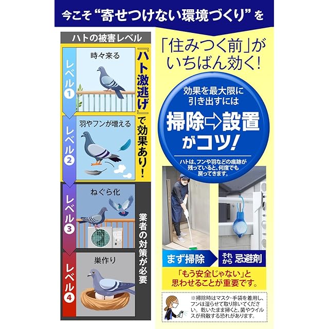 【ご注文前にお読みください】この商品はハト対策に効果的ですが、自然の生き物を対象とするため、全ての状況で効果があるとは限りません。以下の点にご留意いただき、ご納得の上、ご注文をお願いいたします①使用環境:強風の環境下ではニオイ成分が拡散し、通常の効果が発揮しにくくなります。②周囲の状況:近隣の住宅・アパートにハトが特に好む場所(巣など)がある場合、忌避が困難なことがあります。また繁殖期・巣作り中には忌避剤を無視して、お気に入りの場所へ留まる可能性が高まります。③個体差による違い:同じ種類のハトも感受性や行動パターンが異なり、特に若く健康なハトは抵抗力が高いことがあります。【重要 :巣作りの段階に入ってしまった鳩被害は、業者へ依頼して一回徹底的に洗浄・対策をしてもらうことをお勧め致します】※忌避剤による対策と同時に”鳩のフンや巣の匂い”を放置せず、根気強く定期的な掃除を心がけることが重要です。※他の忌避対策と併用するとより効果的です。