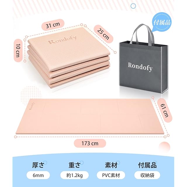 商品名:Rondofy ヨガマット 折りたたみ 6mm トレーニングマット 折り畳み 持ち運びに便利 エクササイズマット フィットネス ピラティス ヨガマット 人気 収納袋付き (ライトピンク)