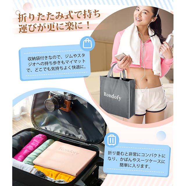 【持ち運びが便利】人気フィットネスブランドRondofyのヨガマットが登場!ロール状のトレーニングマットなら持ち運ぶのは簡単ではなく、大変です。そんな悩みを解決してくれるのは、折りたたみ式ヨガマット。長さ31センチまで折り畳めるコンパクトサイズで、片手で持てる折りたたみ式になっています。専用バッグも付いているので、自転車のカゴに簡単に入れられ、ジムやヨガのレッスンに持ち運ぶのにすごく便利!ヨガやストレッチフィットネスやトレニングに最適です。