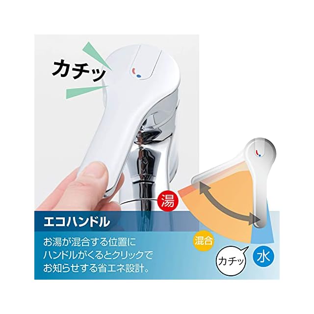 【省エネ設計のエコハンドル】お湯が混合する位置になるとクリックでお知らせ。無駄な給湯エネルギーを使わず、光熱費節約やCO2削減につながります。お湯の温度や流量の調節はレバーひとつで簡単です。