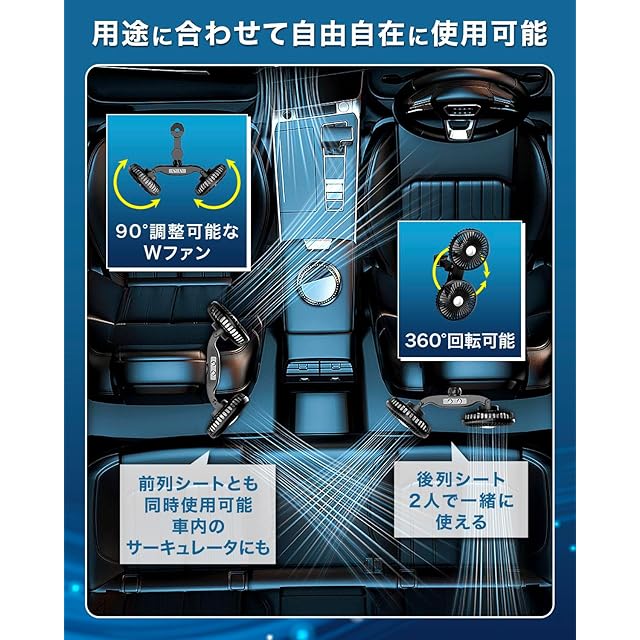 【デュアルファン搭載】2つのファンが装備されており、車内の空気を効率的に循環させます。二人でも同時に使用可能