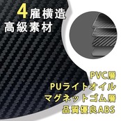 表面は、おしゃれなカーボンシート調です。貼付面は、シリコンでコーティングされているので、マグネットゴムに含まれる可塑剤や鉄粉が直接ボディに触れることがなく、塗装を傷めません。