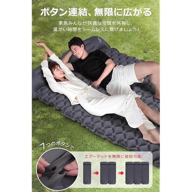 【高級ベッド級の寝心地!10cm厚のエアーマットで極上の快適さ】キャンプや車中泊で「寝心地が悪くて熟睡できない…」そんな悩みを一気に解決!このエアーマットはたっぷり10cmの厚みがあり、地面の凹凸や硬さを感じさせません。さらに、独自の凹凸クッション構造が体圧を分散し、長時間寝ても腰や背中が痛くなりにくい設計。枕一体型デザインだから、追加の枕を用意する手間も不要で、どんな寝姿勢でも快適に過ごせます。まるで自宅のベッドで寝ているような極上の寝心地を実現し、アウトドアでも翌朝スッキリ快適に目覚められます!