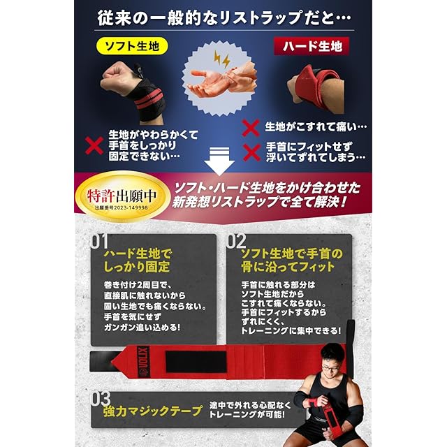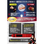 【特許出願中の2種類の生地を使った新発想リストラップ】ソフト生地×ハード生地をかけ合わせた今までにないリストラップ。 【ハード生地でしっかり固定】巻き付け2週目で直接肌に触れないから固い生地でも痛くならず、手首をしっかり固定してガンガン追い込める 【ソフト生地で手首にぴったりフィット】手首に触れる巻き付け1週目はソフト生地だから擦れて痛くならない。手首にフィットするからずれにくく、トレーニングに集中できる 【現役フィジーカー監修】さらに開発スタッフもトレーニーで、実際に使う人の悩みから生まれた新タイプの商品です。繋ぎ合わせ部分の縫製方法など何度も試行錯誤を重ね、実際のトレーニングで使用しテストし完成に至りました 【構成素材】ポリエステル、ゴムラテックス【特許出願中 出願番号2023-149998】