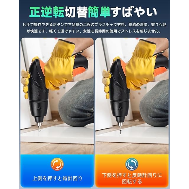 「ワンタッチで切り替え、耐久性も抜群」ボタン一つで正転・逆転を自在に切り替えられるため、ネジの締め付けや緩めがスムーズに行えます。また、耐久性の高い素材を使用しており、力をしっかりと伝えるため、ネジを緩める際や締める際の安心感が向上し、長期間使用しても摩耗しにくい設計となっています。職人でも使用できるクオリティを実現しています。