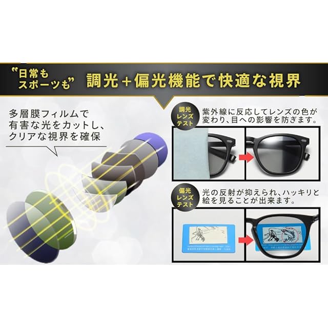 【最新型・調光×偏光サングラス】✅最新型の偏光・調光サングラスは、2つの機能を備えたレンズにより、乱反射を抑えつつ、目を保護しながら明るくクリアな視界を提供します。1本で屋内外どちらでも快適です!薄めのカラーで日常使いにも最適。夏のアウトドア、秋の紅葉散策、冬のスキー、春の花見はもちろん、お釣り、ゴルフ、日常のウォーキングやドライブなど、季節を問わず幅広いシーンで活躍します。 ✅※調光後でもレンズが濃くなりすぎることはありません。濃い色をご希望の方には調光なしタイプをおすすめします。