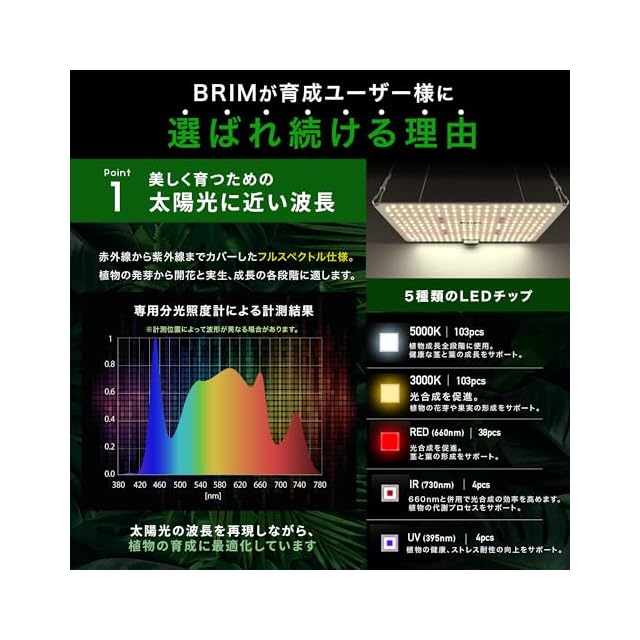 【太陽光に近い波長&高演色】美しく育てるために必要な太陽光を再現したフルスペクトル仕様を採用。IR/UVを搭載した5種類のLEDチップで、演色性評価数(CRI)ではRa90-94の高演色を実現。太陽の下のような植物本来の鮮やかな色が広がります。