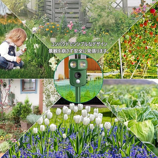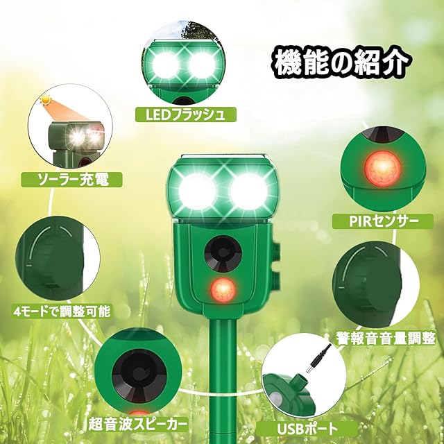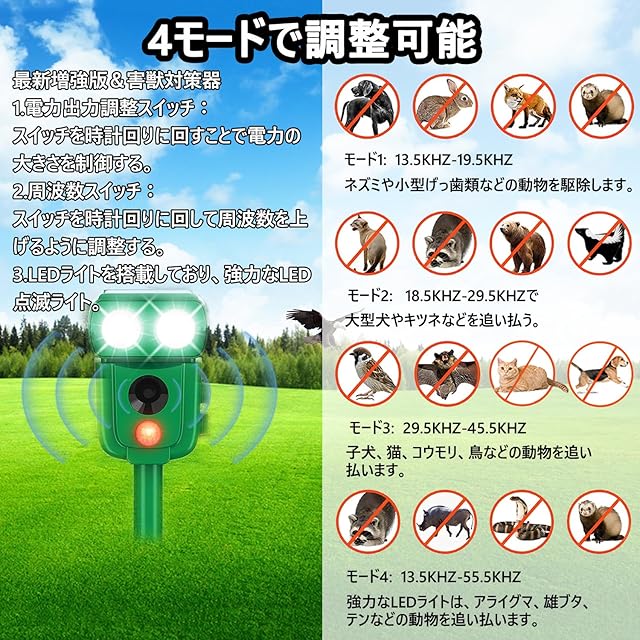 【超音波&LEDライトで動物を撃退】この害獣撃退器は広範囲超音波とLEDフラッシュ組み合わせた総合5つのモードがあります、周波数は13.5kHz 〜55.5 kHzの広い範囲、多種類の動物を対応して撃退できます。LEDライトを搭載、超音波の特定の周波数に適応してしまい受けにくくなる有害動物も、強力なLED点滅ライトとで効果的に追い払います。また、感度調整のダイヤルもあり、場合によって調整できます。超音波センサーのため、少し音が聞こえます。人と動物に無害ですが、室外に置いた方をおすすめいたします。