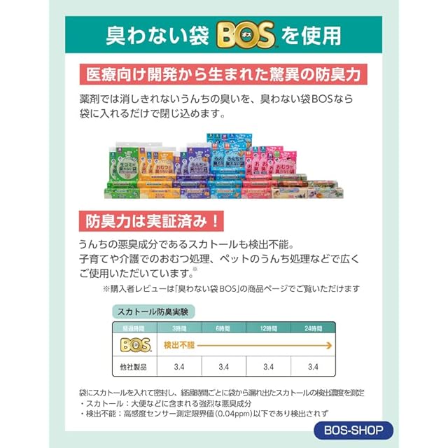 臭わない袋BOS、凝固剤、汚物袋、便器カバーの4点セット+カラーで見やすい取扱説明書付き