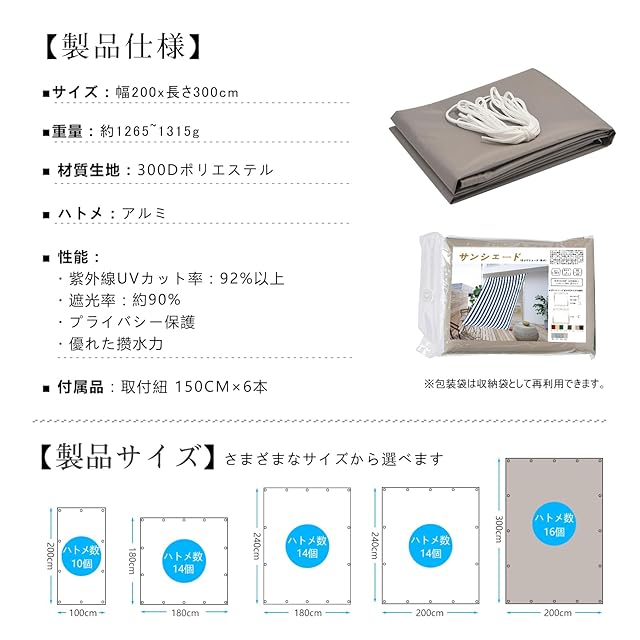 錆びないのゴールデンアルミハトメが付いているので、付属品:6本x1.5m取付けひも、ベランダや窓ペ、廊下、庭下、庭先、玄関などに簡単に取り付けることができます。お洒落なデザインなので、日よけだけでなく、ご自宅やお庭のエクステリアとしてもご利用なれます。
