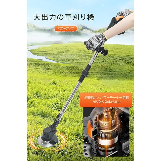 <b>草刈り機 充電式草刈機 コードレス 伸縮 角度調整 枝切り 刈払機</b><br> 1:草刈り機のワイヤレス設計で、充電式草刈機ならではの高効率なパワーを実現。 <br> 2:草刈り機は伸縮自在で、収納しやすく持ち運びも便利。 <br> 3:草刈り機の簡単操作設計で、初心者でも使いやすい充電式草刈機。 <br> 4:草刈り機は多様な刃に対応し、さまざまな用途で活躍する充電式草刈機。<br> 5:草刈り機は角度調整が可能で、多重保護設計により安全性を強化。<br> ●充電式草刈り機で自由な刈り込みを実現!コンセントの制約から解放され、21Vバッテリーと高効率な銅製モーターにより、パワフルかつ効率的な作業が可能です。充電式 草刈り機なら、一度の充電で駐車場10台分の草刈りが簡単に完了します。<br> ●ステンレス製の伸縮ポールを採用し、最大140cmまで調整可能。折りたたむと110cm、最小64cmまで縮小できるため、収納や持ち運びも便利です。身長に合わせて調整でき、腰や脚への負担を軽減します。コンパクトに折りたたんだ草刈り機 充電式は車にも簡単に積み込め、場所を取りません。<br> ●軽量設計とリング型ハンドルで、初心者でも扱いやすい!簡単な取り付けと直感的な操作で、枝の刈り込みや雑草の除去に適しています。充電式草刈機のハンドルは握りやすく、角度や位置を自由に調整できるため、作業がよりスムーズに。<br> ●用途に応じた4種類の交換刃(ナイロン刃・鉄板刃・草刈り刃・鋼刃)を標準装備。公園や庭、野外の雑草除去から作物の収穫まで、さまざまなシーンに対応します。速度調整機能付きで、高速設定はパワフルな刈り込みに、低速設定は精密な作業に適しています。<br> ●作業ヘッドは最大90度まで回転し、様々な地形に適応。二重起動装置が安全性を高め、保護カバーが雑草の飛散を防ぎます。また、底部の防衝撃線が刃を保護し、耐久性も向上。安心・便利な充電式草刈り機で快適な草刈り作業をお楽しみください!<br>