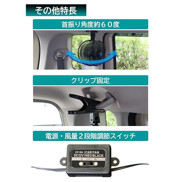商品名:メルテック(meltec) カーファン 150mm DC12V車用 強力涼風 (風量2階調節・クリップ/ビス固定・首振り機能付き(約60度)) ブラックCF-106