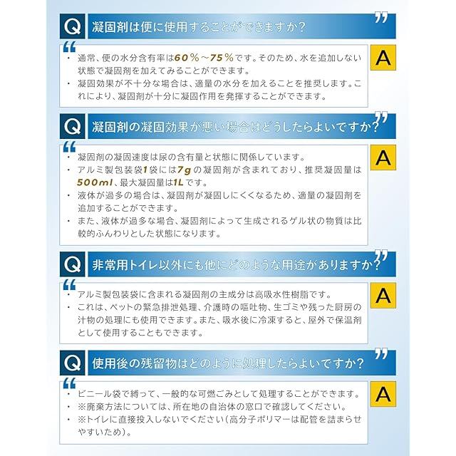 非常用トイレ 凝固剤 は、災害時やアウトドア活動に欠かせないアイテムです。当社の製品は 1 袋 7 グラムで、1 セットで 100 回使用可能です。各袋は個別包装されており、持ち運びが容易で衛生的です。この凝固剤は強力な抗菌・消臭効果を備えており、不快な臭いや細菌の繁殖を効果的に抑えます。簡易トイレ、災害用トイレとしても活躍し、地震や災害時の避難生活や断水時に大変役に立ちます。また、吸水ポリマーを搭載しており、優れた吸水性能を発揮します。トイレ凝固剤として、大便や小便の処理に便利で、簡易トイレ凝固剤としても高い性能を示します。 簡易トイレ、ポータブルトイレ、災害用トイレとして、登山や防災時、渋滞中など、様々なシーンで大活躍します。携帯トイレとしても便利で、いつでもどこでも使用できます。防災トイレ、非常用トイレとしても頼れる存在で、防災グッズとしてもおすすめです。家庭、法人、学校向けにもおすすめで、非常時に備えて安心してご利用いただけます。 高品質の素材を使用しており、長期保存が可能です。一度購入すれば、いざという時に迅速に対応できます。トイレ凝固剤は、非常用トイレ、簡易トイレ、災害用トイレなどに不可欠なアイテムです。