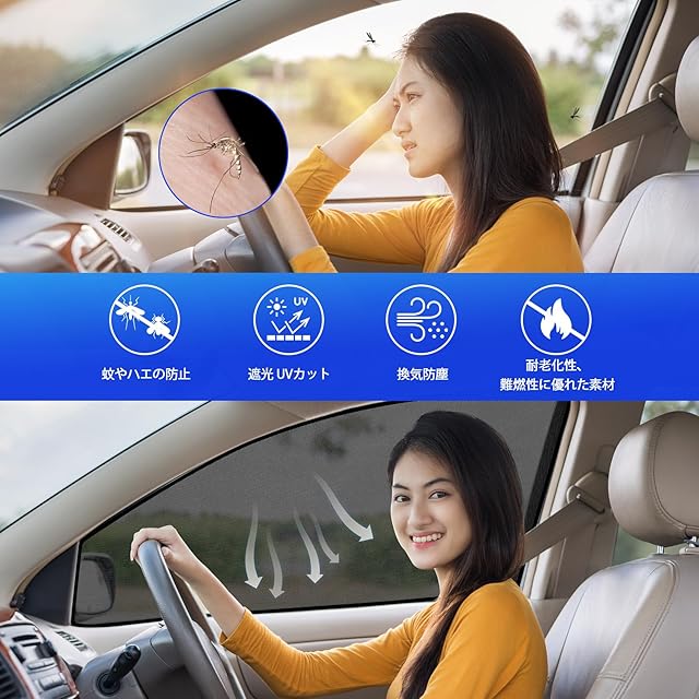 【遮光・通気・虫除け】太陽光をしっかりと遮断してくれます。素肌だけでなく、車の内装を日光による劣化から保護します。空気をよく通すメッシュ生地を採用しており、夏でも風を感じる快適な車内空間をつくり上げます。なお、全面保護で、蚊やハエの侵入を防ぎ、車中泊や仮眠時に大人も子供も害虫から守ってくれるので安心して休めます。