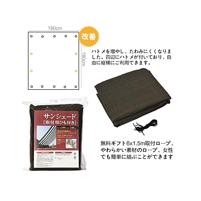 取り付け:錆びないのゴールデンアルミハトメが付いているので、付属品6x1.5m取付けひも、ベランダや窓ペ、廊下、庭下、庭先、玄関などに簡単に取り付けることができます。お洒落なデザインなので、日よけだけでなく、ご自宅やお庭のエクステリアとしてもご利用なれます。
