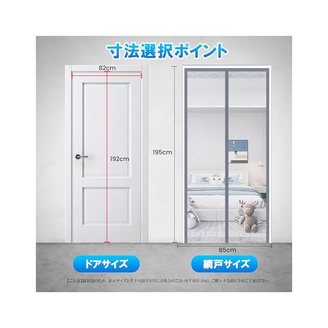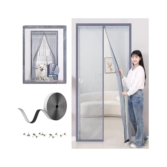 ドア枠の内寸によって設置できる網戸のサイズが変わりますので、購入前に必ずドア枠の内寸をご確認ください。【注意】縫製品のため、表記サイズより若干(1cm程度)異なる場合がございます。ご購入前にご注意ください。 【耐久性】: 防虫網戸は磁気設計を採用しており、繰り返し開閉できます。高品質のダイヤモンド糸を使用し、精密なステッチと高密度メッシュ技術を採用しているため、耐久性があり、頻繁に開閉しても摩耗しません。さらに、防虫網は取り外し可能なので、直接洗うことができます。メンテナンスも簡単です。 【取り付け簡単シアーカーテン】ベルクロが付いているので、たった3ステップで簡単に取り付けられます。風を防ぐために、カーテンの底の両側に重りのブロックが付いており、カーテンのドレープ重力を強化して耐風性を高め、カーテン全体の滑らかさも向上させます。 【通気】ドア網戸は細かいメッシュで、自然な通風と光が通り、空気の循環が良くなり、防虫・通気の効果があります。蚊が大量発生する夏場は、ドアや引き戸、バルコニーなどの通気口を開けることで、虫やホコリなどの侵入を防ぎながら涼しい空気を取り入れることができます。 【複数のサイズオプション、幅広い用途】あらゆるタイプのドアや場所に合わせて、さまざまなサイズをご用意しています。正面玄関や裏口、内外のドア、玄関、ポーチなどに最適です。製品にご満足いただけない場合やご質問がございましたら、お気軽にお問い合わせください。