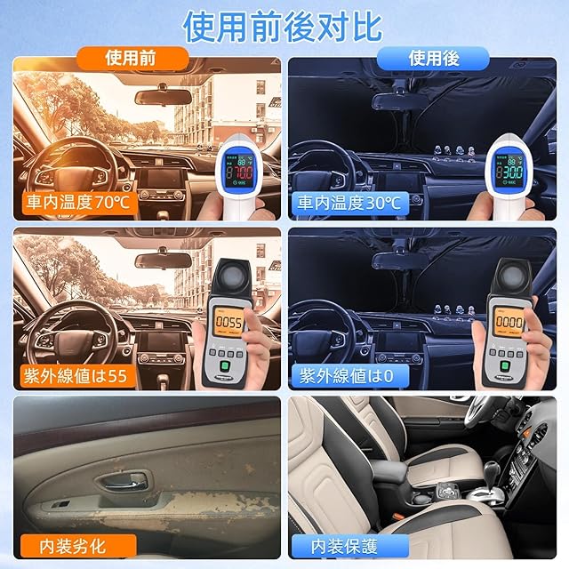 【内装保護・猛暑対策】直射日光による内装の劣化を防止。ハンドルやダッシュボードの変色・ひび割れから愛車を守ります。駐車時に使用すれば、戻った時の車内が驚くほど涼しく、蒸し暑さに悩まされることもありません。
