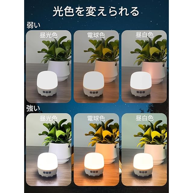 【光色は4タイプ】色温度は3500K-7500K調節可能で、LEDライトの光色は昼光色、電球色、昼白色、SOS赤色ライト点滅モードの4種類が備えています。白っぽく青みがかった色が特徴のもっとも明るい「昼光色」、オレンジっぽく暖かみのある暖色系の「電球色」、もっとも自然な光の色に近いと言われる「昼白色」があり、テーブルやベッドサイド、屋外、車中泊など、好みやシーンにあわせて切替ができます。普段の光色変更操作から操作方法が使分けたSOS赤色点滅モードも備えています。
