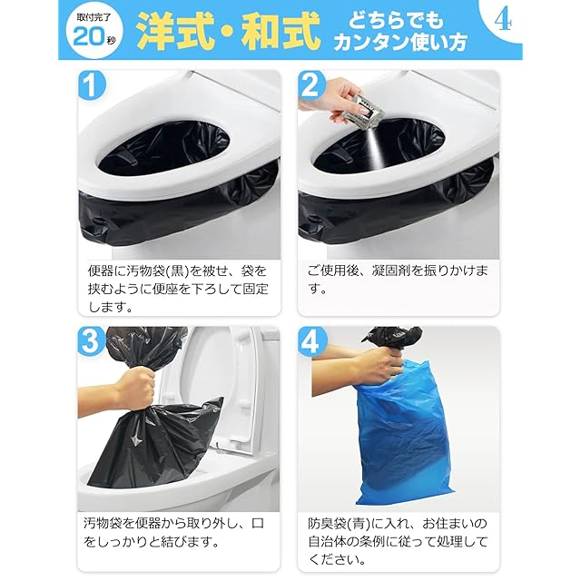 ✅【カンタンな使い方】便器に汚物袋をセットして用を足した後、凝固剤をふりかけます。そして、袋を便器から外し、口をしっかり結んでから防臭袋に入れてOKです!厚手の汚物袋は破れにくく、使い捨て手袋付きで清潔に処理可能。突然の断水時でも手を汚さずに安心してご利用いただけます。