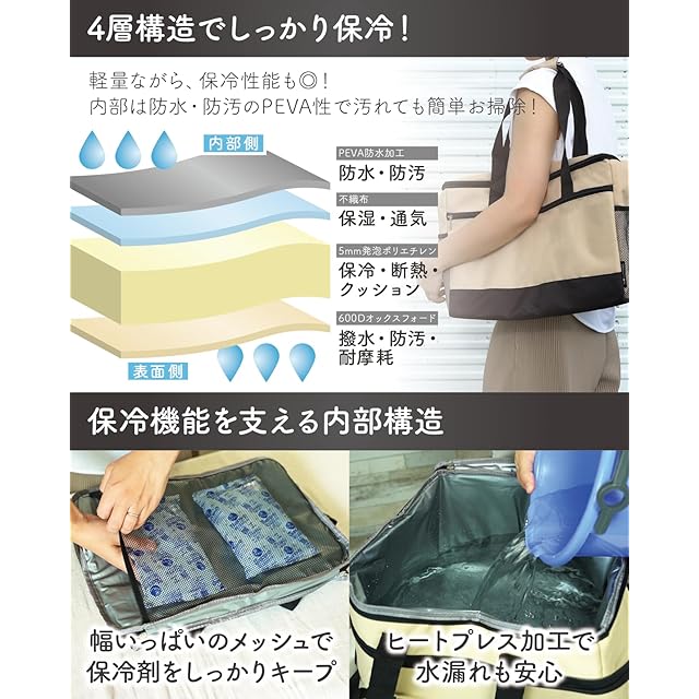 ◆優れた品質と機能/RIMINAのクーラーバッグは、品質と機能性の両方を兼ね備えています。内部には、PEVA、不織布、5mm発泡ウレタン、撥水オックスフォード生地の4層構造を採用し、保冷力を強化。さらに、内部にはホットプレス加工が施され、水漏れを防止する設計になっています。外部は全面撥水生地で作られており、汚れやキズに強く、耐久性に優れています。肩ベルトは取り外し可能で、肩掛け時には肩パッドが付いているため、長時間の使用でも肩に負担をかけません。こうした高品質な素材と多機能なデザインが、クーラーバッグを長く愛用できるポイントです。