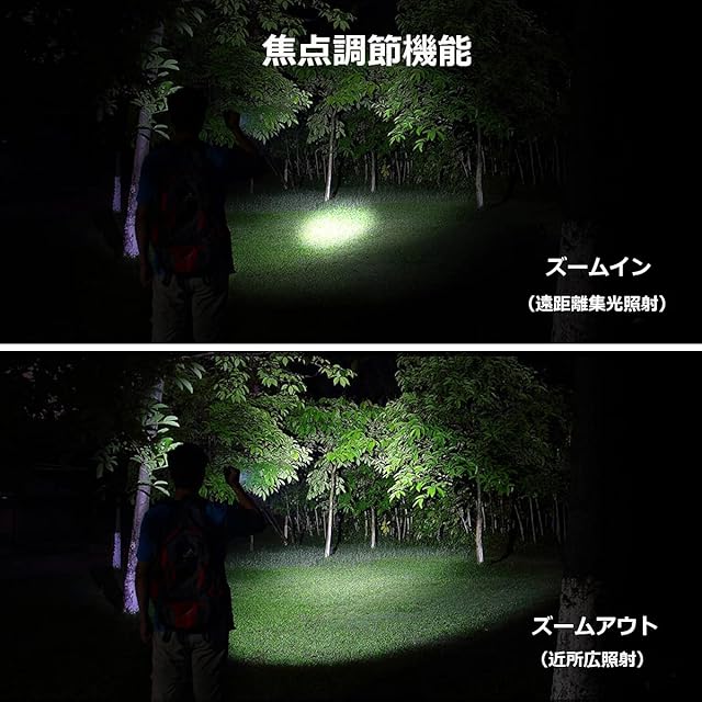 【便利なズーム式・5種類の点灯モード】この懐中電灯には、伸縮式のフォーカスレンズが搭載されており、ヘッド部分を引っ張ることで光の焦点距離や照射範囲を調整することができます。これまで夜間の安全性を気にしていた方におすすめです。さらに、ハイ、ミドル、ロー、フラッシュ、SOSの5つの点灯モードを搭載しています。用途に応じてモードを変えられるので、とても便利です。
