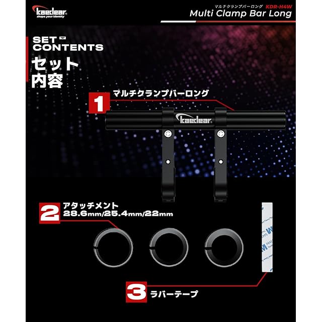 【商品詳細】 ■バー長さ:203mm、径:22mm ■クランプ径:22/25.4/28.6/32mm、マウント幅:15mm、全長:106mm 、■軸間の延長量:70mm、■重量160g ■材質:アルミニウム合金、■内容:バー、マウント×2本、アタッチメント(22/25.4/28.6)×2、六角レンチ ■取扱説明書(オンラインのみ):環境負荷の軽減を目指した脱炭素化への取り組みとして、紙媒体での同封を控えさせていただいております。Kaedear公式サイトの各商品ページから閲覧またはダウンロードが可能です。