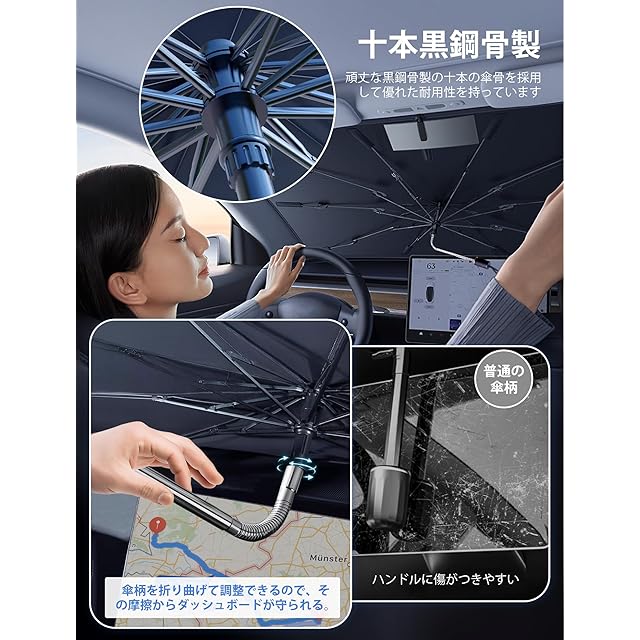 サンシェード 車 フロント 傘型 折り畳み式 遮熱 遮光 UVカット 紫外線遮蔽 車中泊 仮眠 車用パラソル 取付簡単