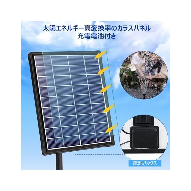 「3000mAh充電電池」このソーラーポンプ 屋外はアップグレードされたソーラー ポンプです。予備電池3000 mAhは夜は動作しない設置で、太陽が強い時に、噴水しながら充電可能です。蓄えた電力は曇りやかすかな日差しでも動作します。