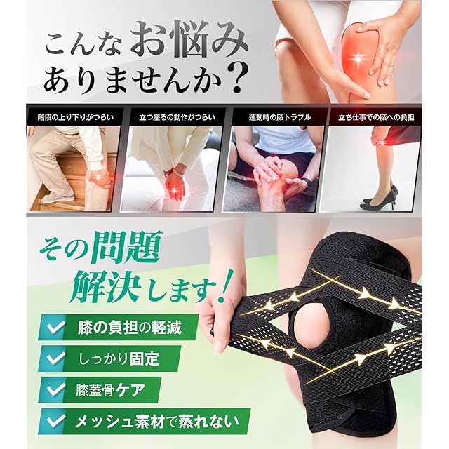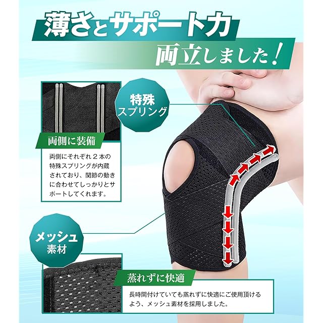 ✅【特殊スプリングを両側に装備】膝サポーターには、両側にそれぞれ2本の特殊スプリングが内蔵されており、膝の曲げ伸ばしに自然にフィットする設計です。運動や活発な動作を行う際の着用に適しています。
