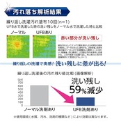 【繰り返しの洗濯で実感!洗い残しに差が出る。】ノーマル水での洗濯に比べ、ウルトラファインバブル水は59%洗い残し減!※疑似汚れとしてタンパク質を溶かした水溶性の液体を着色し、ガーゼふきんに塗布。2時間後、洗剤を規定量の1/10入れて洗濯機洗い(標準コース)を行い、乾燥後、同じ箇所に上記疑似汚れを塗布し洗濯。この工程を10回繰り返し、布に残った汚れを画像解析にて数値化し検証。