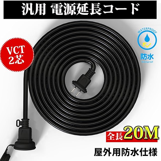 商品名:KIMOC(キモチ) 延長コード 20m 屋外 防水 やわらかい 扱いやすい ブラック 耐寒 耐熱 電源 防雨型 PSE認定 丸型プラグ 電源コード 延長ケーブル 屋外用 電源増設 連結可 コンセント ジョイント 防雨キャップ付 アウトドア インドア 2芯 トラッキング防止 室外専用 電源タップ 20m キャンプ 太くしっかり
