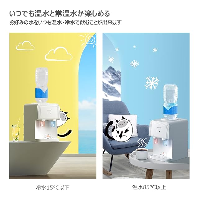 コンフィー(COMFEE') ウォーターサーバー ねこ かわいい ペットボトル式 卓上 家庭用 温水/冷水 コンパクト 2Lペットボトル利用でき キャップ付き 小型 軽量 転倒防止 ねこシリーズ ホワイト 254*296*384mm