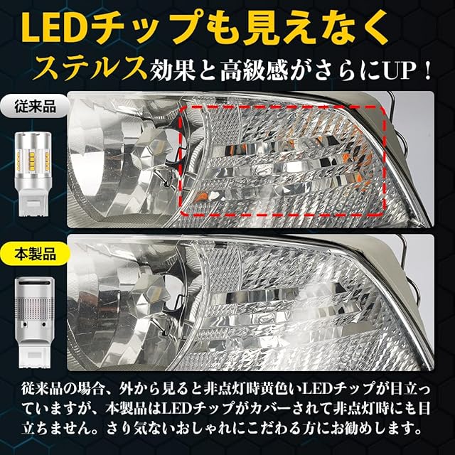 【アルミ製グレア防止カバー搭載】従来の製品とは異なり、このT20 ピンチ部違い LED ウインカーはアルミ製カバーを備えています。まぶしさを程よくコントロールし、激光ではなく"ちょうど良い"明るさを実現しました。片側600lmのあかるさで、上品な丁度良い明るさで後続車に迷惑をかけません。従来品では非点灯時に目立つ黄色いLEDチップが、こちらのT20ピンチ部違いLEDウインカーバルブでは完全にカバーされ、非点灯時にも目立ちません。さり気ないおしゃれを追求する方にお勧めします。