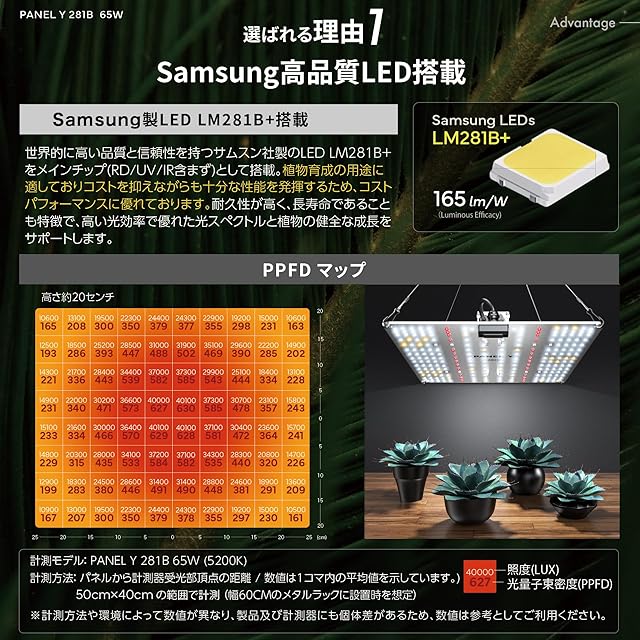 【高効率で安定したパフォーマンス】 Samsung LM281B+チップは、165 lm/Wの高効率を誇り、低発熱で長寿命を実現します。これにより、PANEL Yは長時間の使用でも安定したパフォーマンスを提供し、植物の健康な成長を支えます。