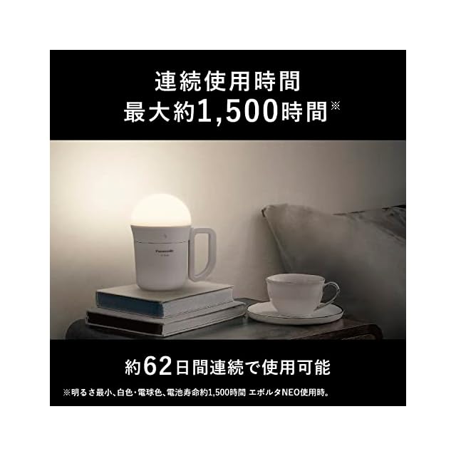 [乾電池エボルタネオ使用] ●白色・電球色 明るさ最大:連続約16時間 ●明るさ最小:連続約1500時間 ●全灯色(白色+電球色) 明るさ最大:連続約8時間 ●明るさ最小:連続約1000時間[乾電池エボルタ使用] ●白色・電球色 明るさ最大:連続約14時間 ●明るさ最小:連続約1350時間 ●全灯色(白色+電球色) 明るさ最大:連続約7時間 ●明るさ最小:連続約900時間[アルカリ乾電池使用] ●白色・電球色 明るさ最大:連続約12時間 ●明るさ最小:連続約1100時間 ●全灯色(白色+電球色) 明るさ最大:連続約6時間 ●明るさ最小:連続約700時間