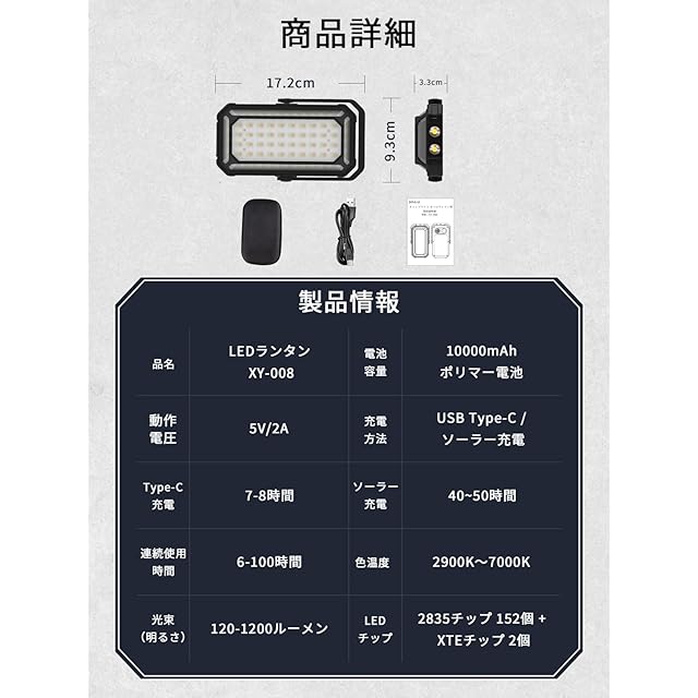 【2025新登場・万能型LEDランタン】旧モデルから進化した新たなLEDランタンXY-008は、インドアからアウトドア、災害時まで幅広く活用できる万能型ランタンです。1200ルーメンの超高輝度、3光色変更、無段階調光、照明エリア調整、14点灯モード、10000mAh大容量バッテリー、デジタル残量表示、ソーラー充電&USB-C充電両用、非常時に使える充電機能などを完備。あらゆるシーンで頼れる充電式ランタンです。