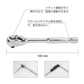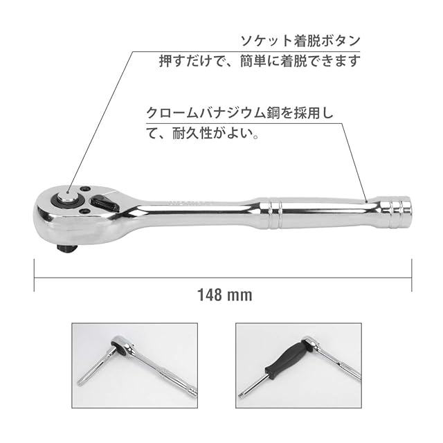 【特徴】ラチェットハンドルはクイックリリースのデザインで、ソケットの脱着はボタンを押すだけで簡単にできる。72山ギアを採用しており、細やかな動きが可能で狭い場所での作業は抜群です。