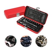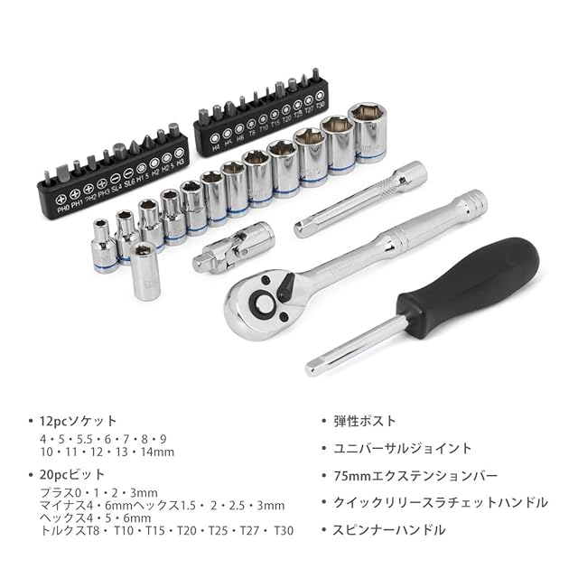 【セット内容】差込角6.35mm(1/4インチ)のツールセットです。クイックリリースラチェットハンドル、ユニバーサルジョイント、75mmエクステンションバー、プラグソケット、スピンナーハンドル、メートル製ソケット12pc(4・5・5.5・6・7・8・9・10・11・12・13・14mm)、ビットセット20pc(プラス0・1・2・3mm、マイナス4・6mmヘックス1.5・ 2・2.5・3mm ヘックス4・5・6mm、トルクスT8・ T10・T15・T20・T25・T27・ T30)。詳しいセット内容は下記の商品情報にご参考をくださいませ。