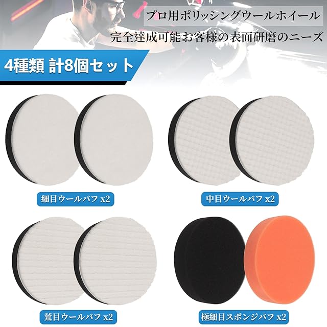 【5種類8個セット】荒目x2(表面のモノグラムのテクスチャー)、中目x2(十字型の表面テクスチャー)、細目x2(表面テクスチャーなし)3種類プロ用ポリッシングホイール + 2個細目ポリッシャースポンジバフ、使用頻度の高いアクセサリーの組み合わせ,完全達成可能お客様の表面研磨のニーズ