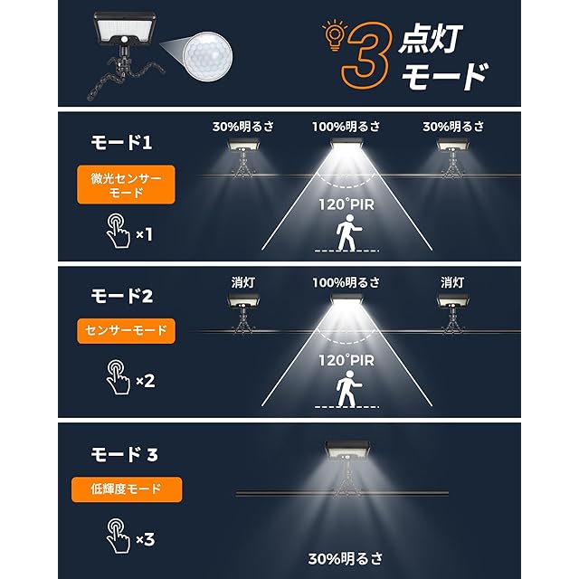 【3モード切替で省エネ&防犯強化】①DIMモード:動体検知時は高輝度点灯、15~20秒後に低照度に自動切替。②センサーモード:人や動物の動きを感知して即時点灯。③常夜灯モード:24時間低光量で基本照明を確保。ledセンサーライトの多機能性で、省エネと防犯を両立。