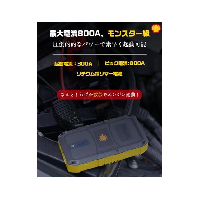 Shell シェル ジャンプスターター 10000mAh大容量 ピーク電流800A 12V車用 エンジンスターター 安全保護機能搭載 車緊急始動 モバイルバッテリー LED緊急ライト搭載 PSE認証済 日本語取扱説明書 SSL-SJP011