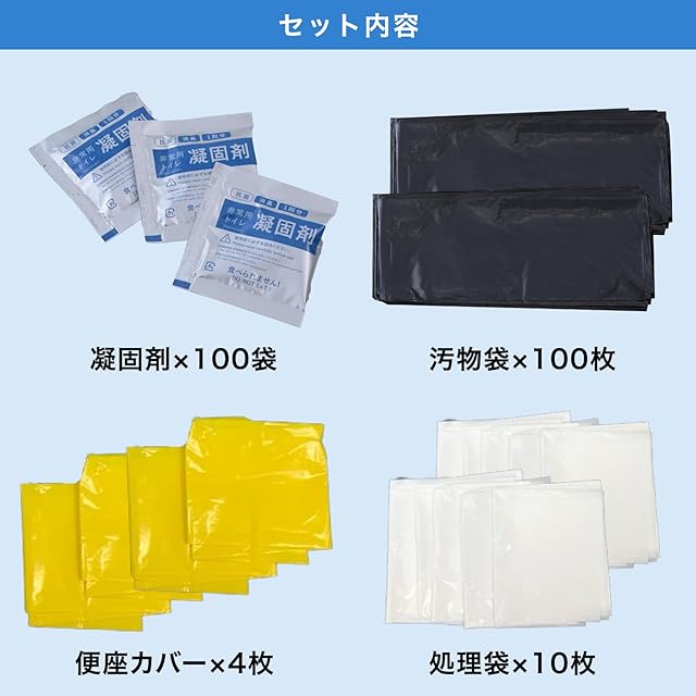 ●セット内容 : 凝固剤(アルミ包装)×100袋(10g)、汚物袋(黒)×100枚(約650×500mm)、便座カバー(黄色)×4枚(約650×500mm)、処理袋(白)×10枚(約650×800mm)●材質 : 凝固剤/高分子ポリマー、汚物袋/ポリエチレン、便座カバー/ポリエチレン、処理袋/ポリエチレン