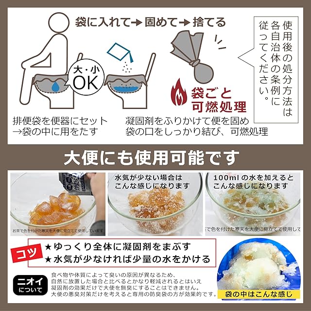 【 特徴 】(※この商品は個包装タイプではありません。80個の凝固剤と80枚の排便袋が箱に入っています)小便・大便のどちらにも使用可能で、凝固剤には高吸水性ポリマーを使用しており、排泄物を素早くゼリー状に固め、アンモニアなどの悪臭をしっかり消臭しつつ、菌の繁殖も抑える除菌効果を備えています。災害対策だけでなく、断水時やアウトドア、介護など多様なシーンで活用されています。防災士監修のもと開発された災害対策用トイレで、断水や停電、地震、台風などの災害蓄用トイレ、キャンプ・登山などのアウトドアトイレ、介護用トイレにもご使用いただけます。