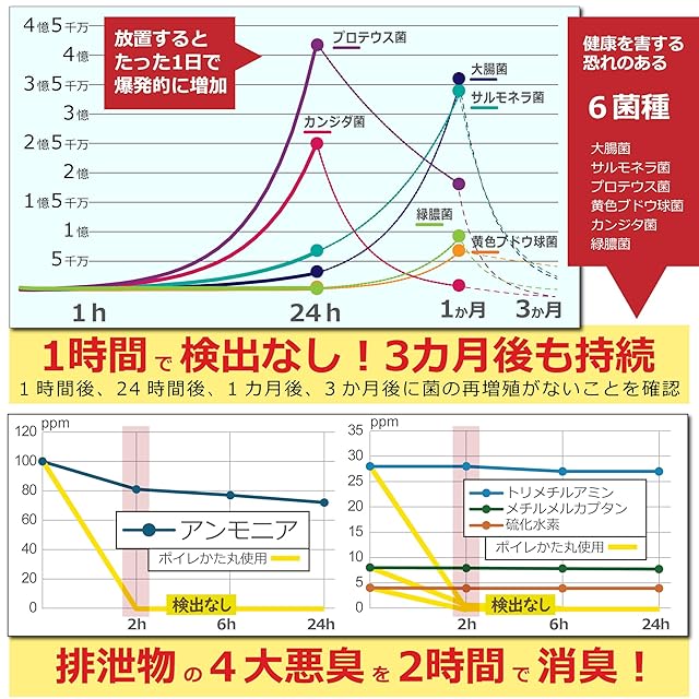 【 凝固剤 】1回分ずつアルミ包装で密封されており、防湿・防水性能に優れた日本製です。最大15年間の長期保存が可能です。(破損や高温多湿を避ければさらに長く使用できるものですが、衛生面や環境による保存品質を考慮し、定期的な確認と交換を推奨しています)アンモニア、メチルメルカプタンなど糞尿の主要な悪臭を抑える消臭力と、主要菌種に対する除菌力を備え、災害用トイレのゴミ処理が滞った際の悪臭や菌の繁殖を抑えます。高吸水性ポリマーを使用し、排泄物を素早く固め、可燃ごみとして処理できます。備※粉末凝固剤は使用時に舞うことがあるため、顔を近づけすぎないようご注意ください。
