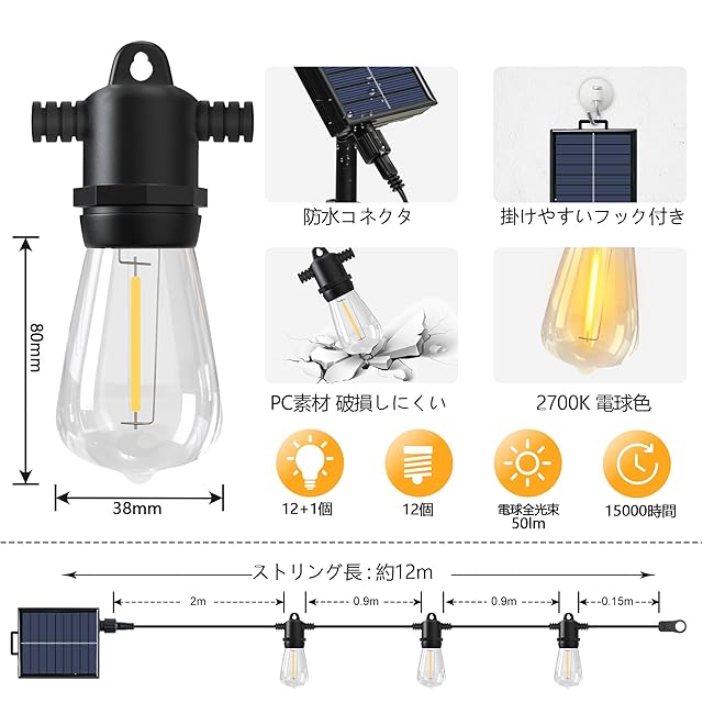 商品名:ストリングライト ソーラー 12m 防雨型 夜間自動点灯 LED電球 13個 電球色 PC素材 破損しにくい 8点灯モード USB充電可能 調光可能 リモコン付き タイマー機能 屋外照明 イルミネーション クリスマス電飾 誕生日 ガーデンライト 庭 祭り 商店街