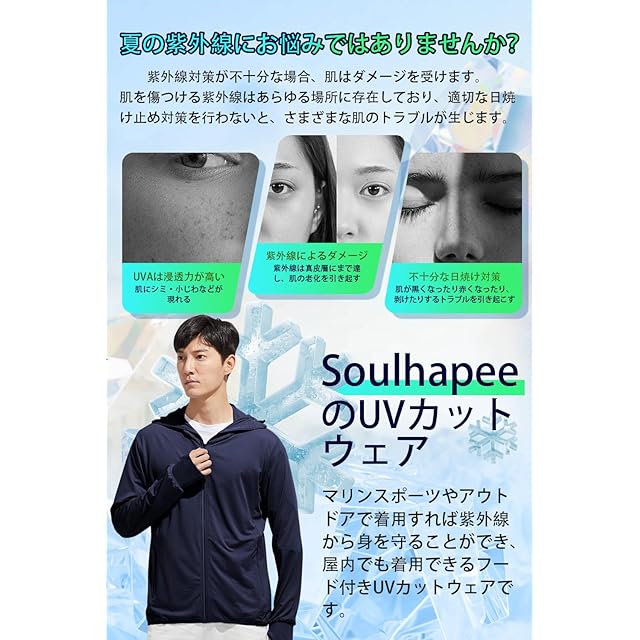 [Soulhapee] ラッシュガード メンズ 日焼け防止 パーカー uvカット パーカー 涼しい 夏用パーカー 長袖 ラッシュパーカー 接触冷感 通気性 UPF50+ アウター 夏 フード付き 紫外線対策