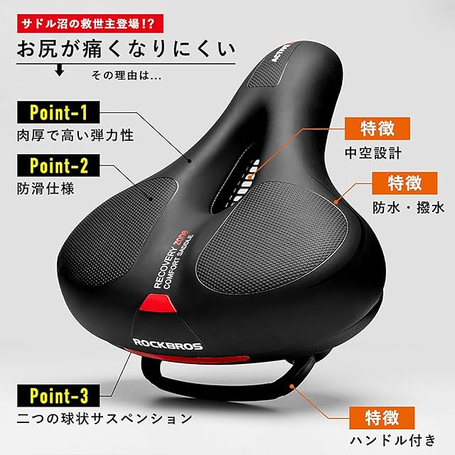 商品名:ROCKBROS(ロックブロス)自転車 サドル 超肉厚 痛くない 低反発 サドルクッション 衝撃吸収 穴開き 通気 ソフト 防水 バック反射テープ クロスバイク マウンテンバイク ママチャリ (レッド)