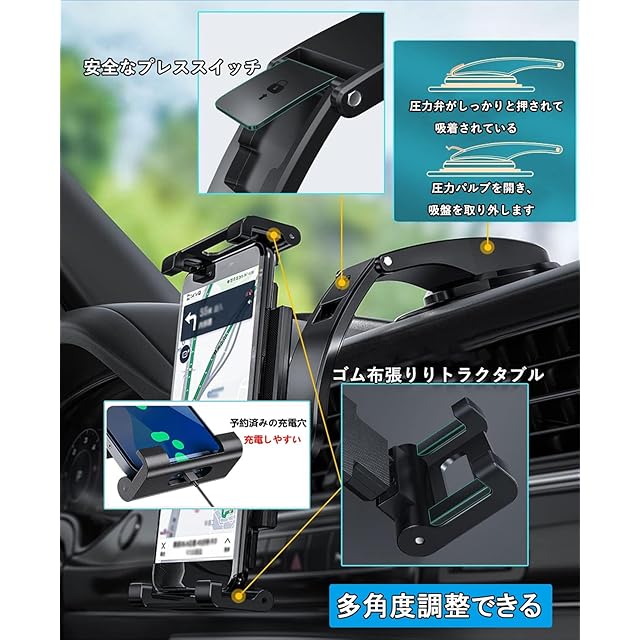 【粘着性抜群なゲル吸盤&安定性抜群】この高耐久真空ダッシュボード吸盤マウントは、車のダッシュボードやフロントガラスに適しています。この車載ホルダーは最新の真空吸着技術を採用し、吸着力が強くて安定性に優れています。高品質の素材で作られ、耐高温で耐久性が抜群です。 粘着パッドを使用すると、吸盤式車載ホルダーは吸盤パッドに取り付けて使用すると、スマホホルダーの安定性が大幅に向上し、従来型のフック式や3段クリップ式と比べて、クリップの先は平らではなく噛み込む様に改良され(ワニの歯のように)、スマホを緩まずがっちり固定できまして、どんな道でも絶対に落ちません。