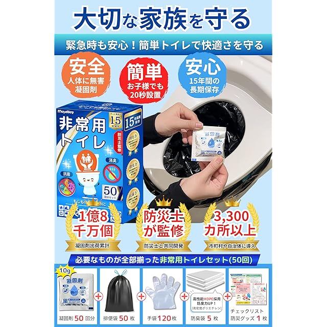 【高吸水性凝固剤】弊店の簡易トイレ用凝固剤は、人体に無害な「アクリル酸重合物ナトリウム塩(高吸水性ポリマー)」を主成分としており、従来品の2倍の吸水能力を持っています。1包(10g)で液体700mlを固めることができ、汚物の水分を吸収してジェル状にすることで、迅速かつ清潔に処理できます。 【抗菌率99.9%・消臭力抜群】汚物を放置すると、大腸菌や黄色ブドウ球菌などのばい菌が異常繁殖します。これらの菌に感染すると、下痢や腹痛、風邪のような二次災害を引き起こす可能性があります。感染を防ぐために、当社の簡易トイレ用凝固剤には銀成分を配合しています。銀成分は、凝固した排泄物内の細菌の活動を死滅させ、菌の繁殖を防ぎ、安全な環境を保ちます。さらに、吸水性ポリマーには消臭効果のある緑茶成分を豊富に配合しており、排泄物の浄化作用と高い消臭効果(5大悪臭)を発揮します。これにより、緊急時の心理的ストレスを軽減し、快適に使用できる環境を提供します。 【排便袋のデザイン3つの大改良】 1、「厚手で丈夫!」当店の簡易トイレ用排便袋は0.068mm(片面0.034mm)の厚さがあり、破れにくくなっています。他社の排便袋は片面0.025mm〜0.03mm程度の薄いものが主流ですが、0.068mmの厚さを選ぶことで安心感があります。 2、「ひも付き」排便袋にはひもが付いているため、手を汚さずに簡単に結ぶことができます。 3、「サイズ改良」防災士のアドバイスを受けて、排便袋のサイズを横65cm×縦50cmに改良しました。縦70cmのサイズで販売されている製品もありますが、大きすぎて使いづらく、廃棄時にかさばります。また、縦が長すぎるため、便器の水につかりやすく、排便袋が濡れてしまうことがあります。 実際に使用する際の使いやすさを考慮し、簡易トイレ用排便袋のデザインを大改良しました。 【半永久保存可能】弊店の簡易トイレ用凝固剤は、自社独自開発の気密性が高く劣化しにくい超防湿アルミパッケージを使用することで、15年の半永久保存が可能です。パッケージに使用期限が明示されており、一目で確認できます。せっかく備蓄していても、いざ使用するときに使えないなんて悲劇を避けるため、包装を強化しました。 【充実なセット内容&安心の長期】必要なものが全部揃ったので、すぐにスタート!◆ひも付きの排便袋x50枚、◆凝固剤x50個、◆防臭袋x5枚、◆ビニール手袋x120枚 ◆説明書x1枚、◆防災グッズチェックリストx1枚 当店では、お客様に長く安心して製品をご使用いただくために「5年安心」をご提供しております。このは、購入日から5年間にわたり、予期せぬ故障や不具合に対して手厚いサポートを提供します。また、商品にご満足いただけない場合は、交換や返金もお受けいただけます。